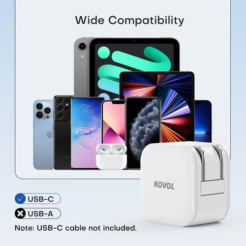 This Kovol sprint 20W PD fast wall charger adopts power delivery PD 3.0 (20W) and QC 3.0 (18W) charging technologies, featuring compact size, foldable prongs, and charging protection. Compatible with iPhone 13 / 12 / 12 Mini / Pro / Pro Max, iPad, Galaxy S10 / S10+, and multi-devices.